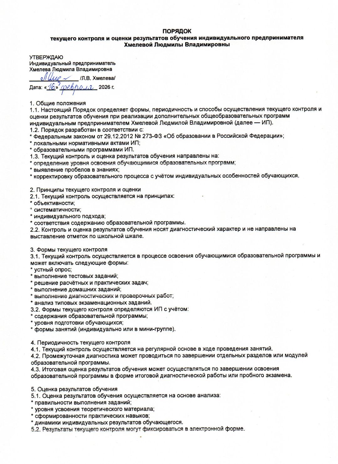1.1. Настоящий Порядок определяет формы, периодичность и способы осуществления текущего контроля и оценки результатов обучения при реализации дополнительных общеобразовательных программ индивидуальным предпринимателем Хмелевой Людмилой Владимировной (далее — ИП).