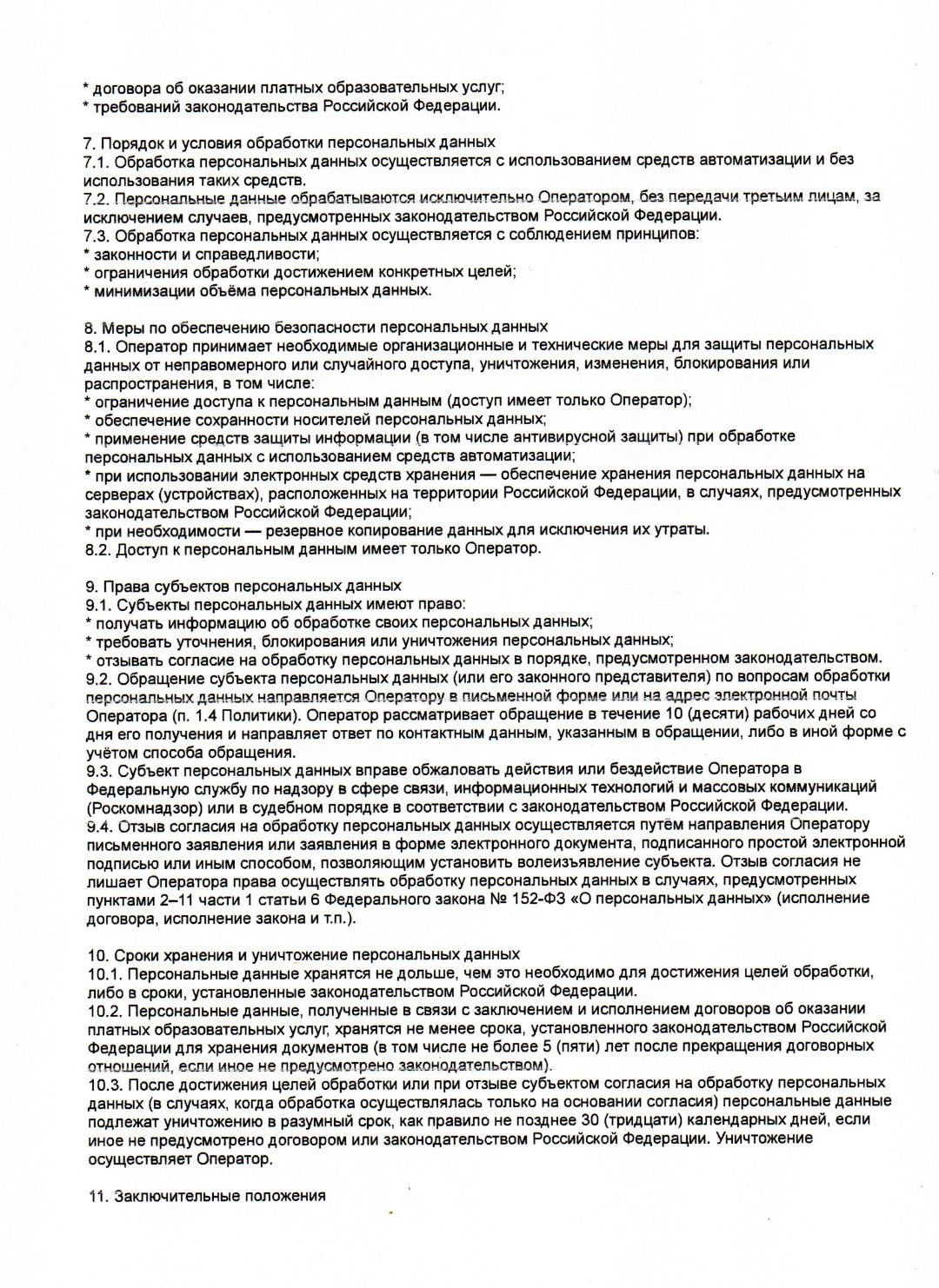 7.2. Персональные данные обрабатываются исключительно Оператором, без передачи третьим лицам, за исключением случаев, предусмотренных законодательством Российской Федерации.