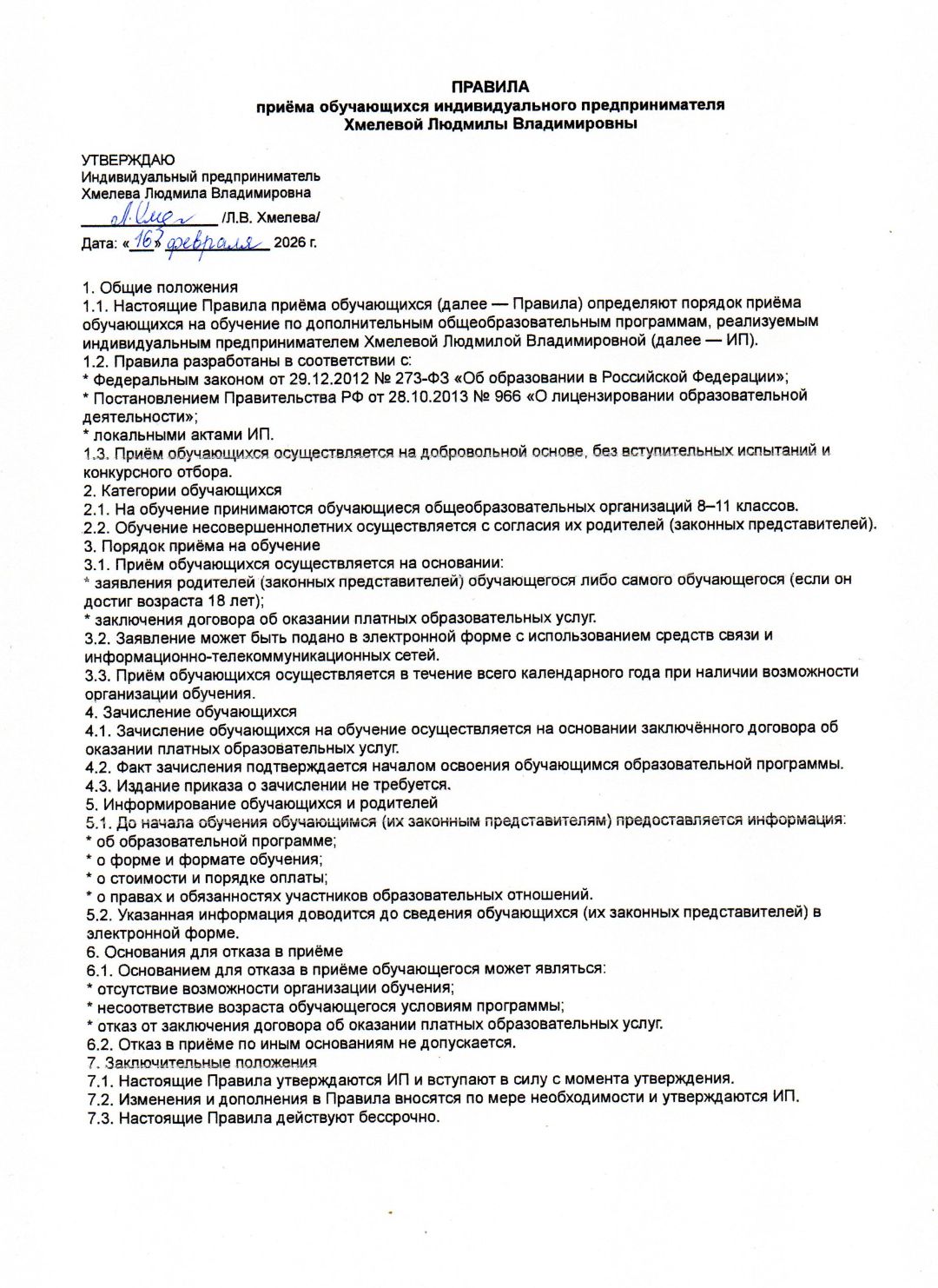 1.1. Настоящие Правила приёма обучающихся (далее — Правила) определяют порядок приёма обучающихся на обучение по дополнительным общеобразовательным программам, реализуемым индивидуальным предпринимателем Хмелевой Людмилой Владимировной (далее — ИП).